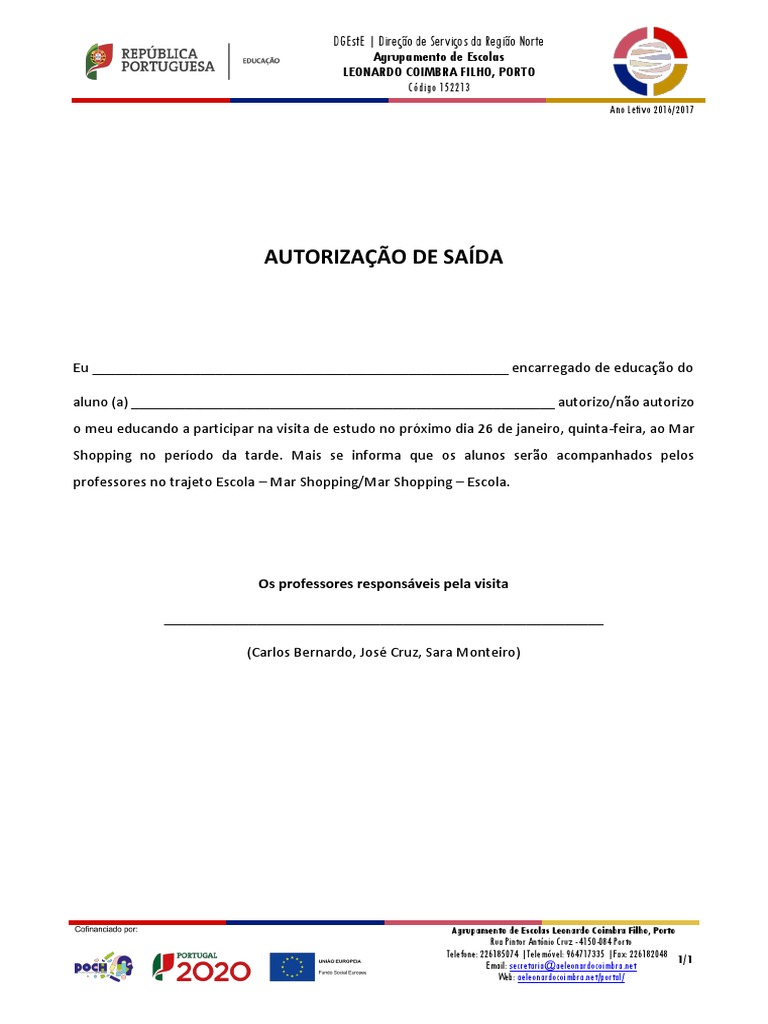 o meu educando a participar na visita de estudo no prximo dia 26 de janeiro, quinta-feira, ao Mar