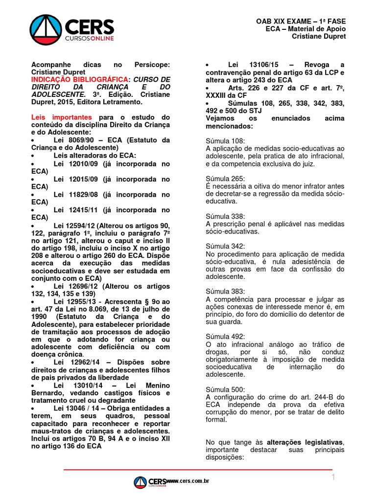 Cristiane Dupret INDICAÇÃO BIBLIOGRÁFICA: CURSO DE DIREITO DA CRIANÇA E DO ADOLESCENTE. 3ª. Edição. Cristiane Dupret, 2015, Editora Letramento.