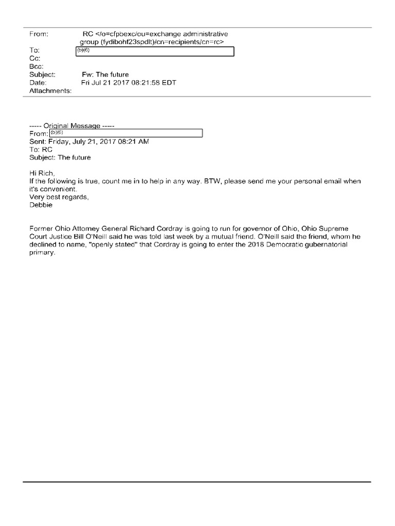 Richard Cordray, the director of the Consumer Financial Protection Bureau (CFPB), a federal consumer agency that was created with the help of Sen. Elizabeth Warren (D., Mass.), received a message on his government email address with an offer to help with his potential Democratic campaign for governor of Ohio, which Cordray then forwarded to an unidentified address, the email obtained by the Washington Free Beacon shows. A government watchdog says the actions could be a violation of the Hatch Act.