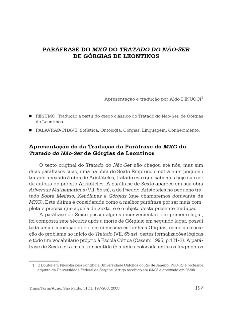 RESUMO: Traduo a partir do grego clssico do Tratado do No-Ser, de Grgias