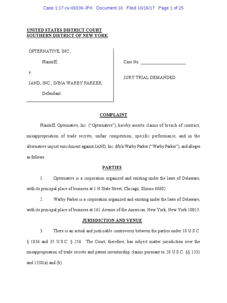 99. Warby Parker subsequently, and without informing Opternative or Dr. Lee, filed the
