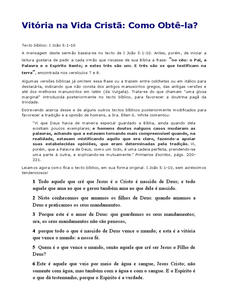 A mensagem deste sermo baseia-se no texto de I Joo 5:1-10. Antes, porm, de iniciar a