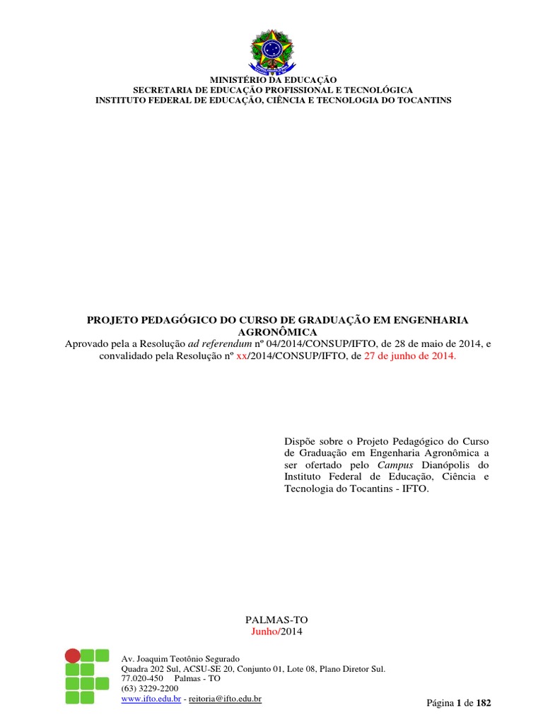 PROJETO PEDAGÓGICO DO CURSO DE GRADUAÇÃO EM ENGENHARIA AGRONÔMICA Aprovado pela a Resolução ad referendum nº 04/2014/CONSUP/IFTO, de 28 de maio de 2014, e convalidado pela Resolução nº xx/2014/CONSUP/IFTO, de 27 de junho de 2014.