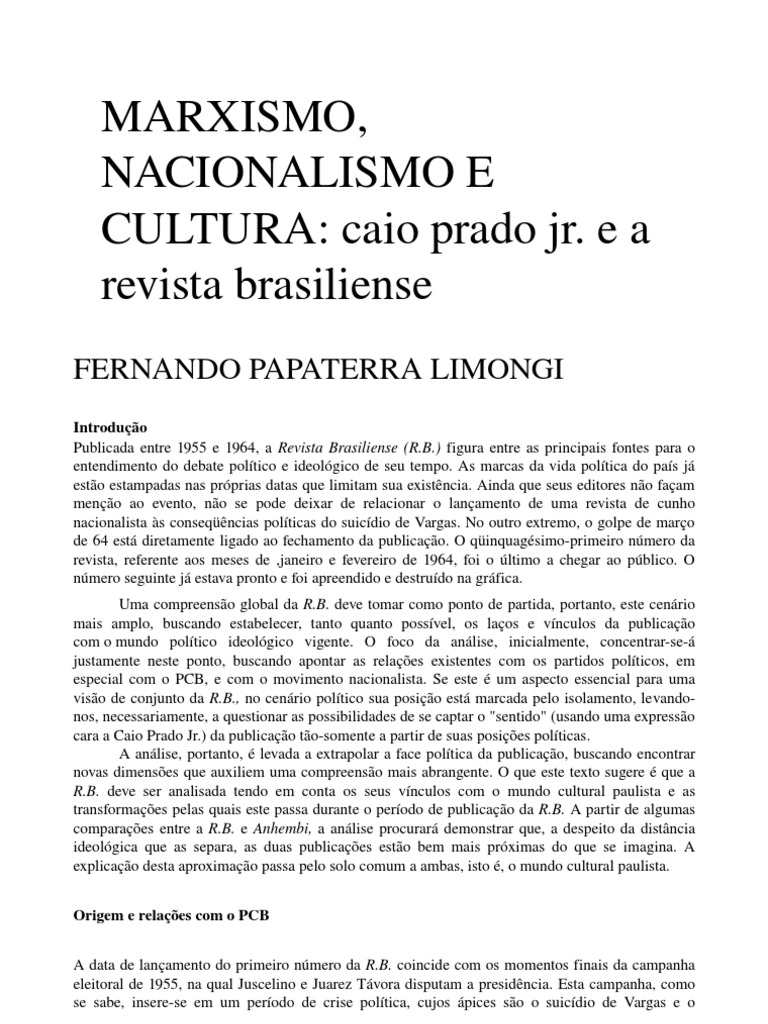 Publicada entre 1955 e 1964, a Revista Brasiliense (R.B.) figura entre as principais fontes para o