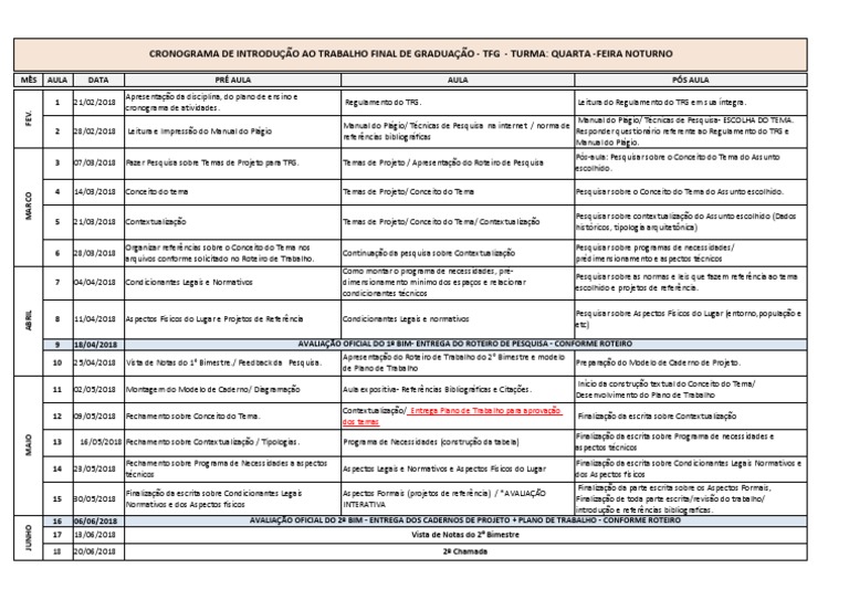 CRONOGRAMA DE INTRODUÇÃO AO TRABALHO FINAL DE GRADUAÇÃO - TFG - TURMA: QUARTA -FEIRA NOTURNO