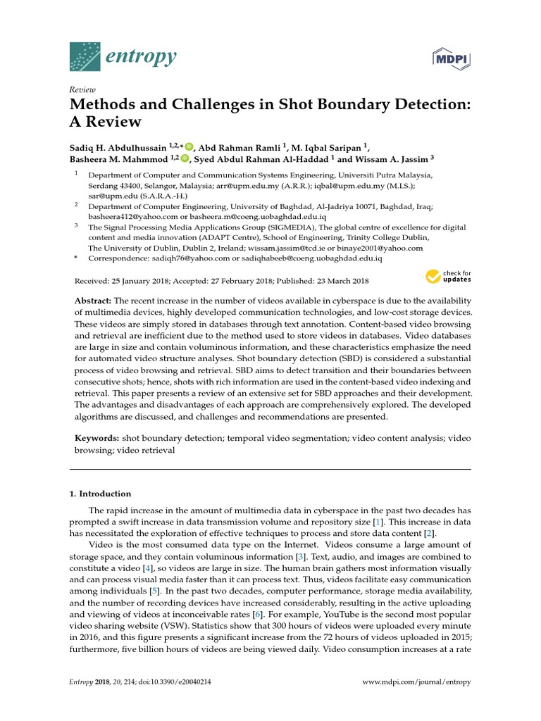 Abstract: The recent increase in the number of videos available in cyberspace is due to the availability of multimedia devices, highly developed communication technologies, and low-cost storage devices. These videos are simply stored in databases through text annotation. Content-based video browsing and retrieval are inefficient due to the method used to store videos in databases. Video databases are large in size and contain voluminous information, and these characteristics emphasize the need for automated video structure analyses. Shot boundary detection (SBD) is considered a substantial process of video browsing and retrieval. SBD aims to detect transition and their boundaries between consecutive shots; hence, shots with rich information are used in the content-based video indexing and retrieval. This paper presents a review of an extensive set for SBD approaches and their development. The advantages and disadvantages of each approach are comprehensively explored. The developed algorithms are discussed, and challenges and recommendations are presented.