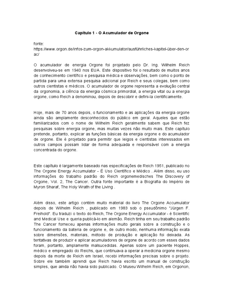 garantir o futuro da pesquisa em energia orgone! Em particular, é necessário evitar a exploração imprudente da energia orgone, tanto através do lucro implacável quanto da indiferença à pesquisa por parte dos Não há intenção de criar um monopólio sobre a produção de acumuladores de orgone. Pelo contrário, tal monopólio não seria aceitável. Os fabricantes podem realizar a construção do acumulador de orgone em maior medida por uma taxa razoável e com um lucro razoável para cada acumulador. Há também planos no pipeline para fornecer informações para aqueles que querem construir sua própria