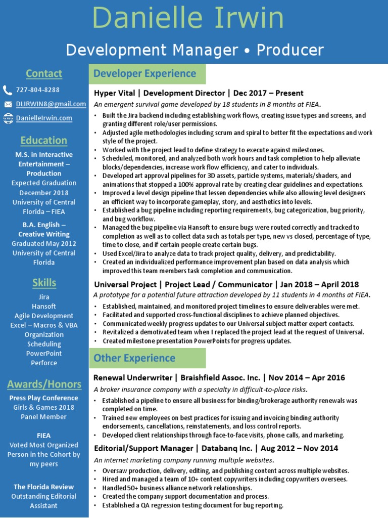 B.A. English – • Managed the bug pipeline via Hansoft to ensure bugs were routed correctly and tracked to