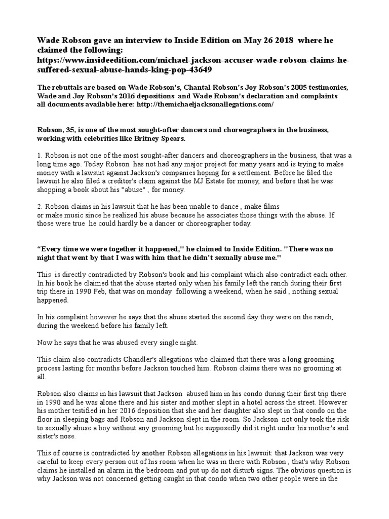 The rebuttals are based on Wade Robson's, Chantal Robson's Joy Robson's 2005 testimonies,
