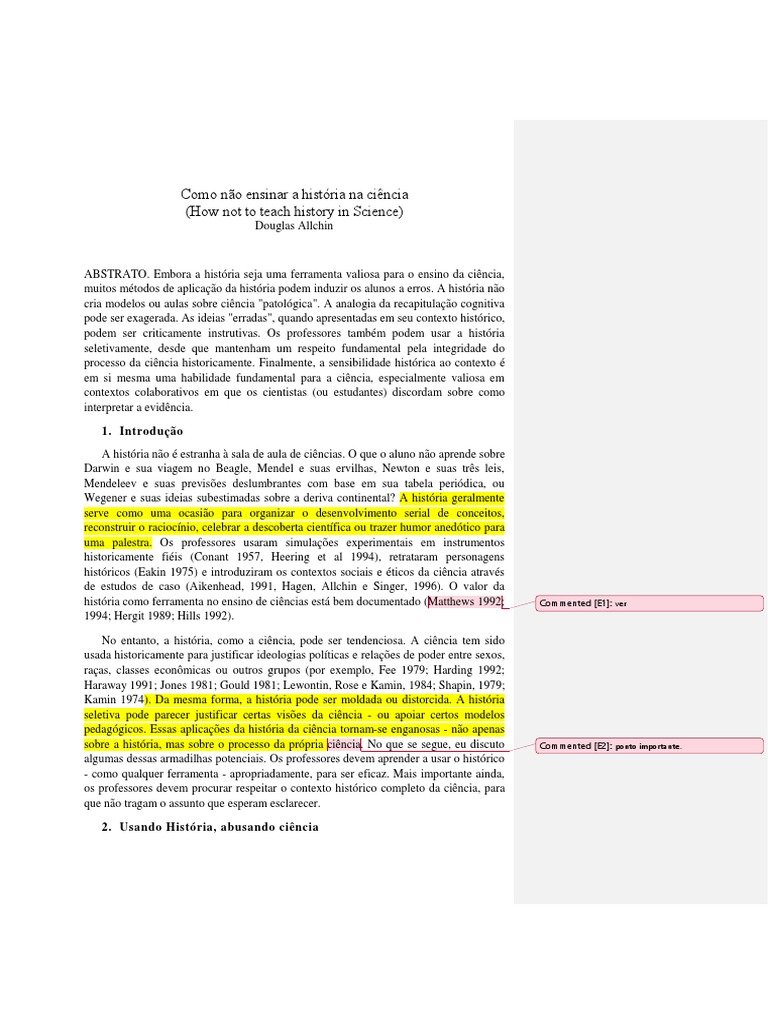 história como ferramenta no ensino de ciências está bem documentado (Matthews 1992; Commented [E1]: ver