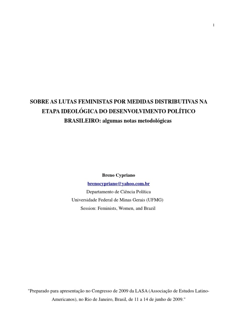 Breno Cypriano brenocypriano@yahoo.com.br Departamento de Ciência Política Universidade Federal de Minas Gerais (UFMG) Session: Feminists, Women, and Brazil