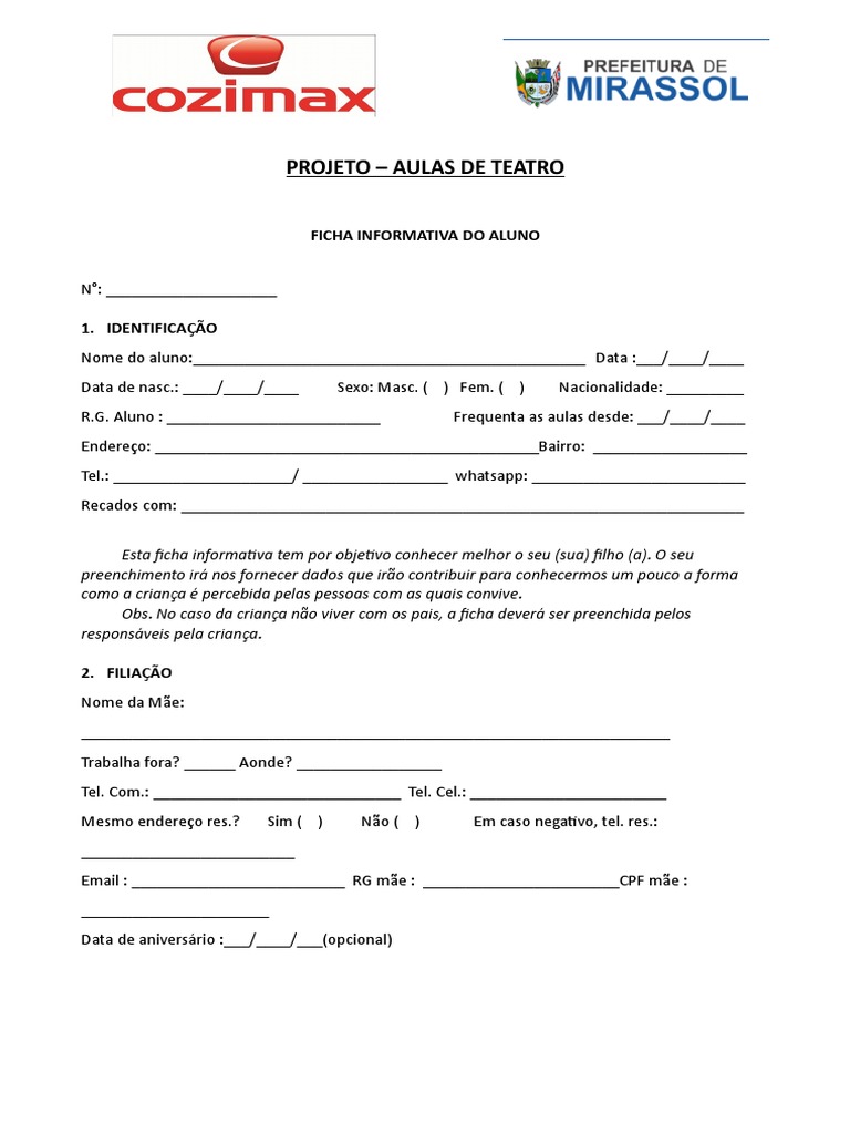 Esta ficha informativa tem por objetivo conhecer melhor o seu (sua) filho (a). O seu