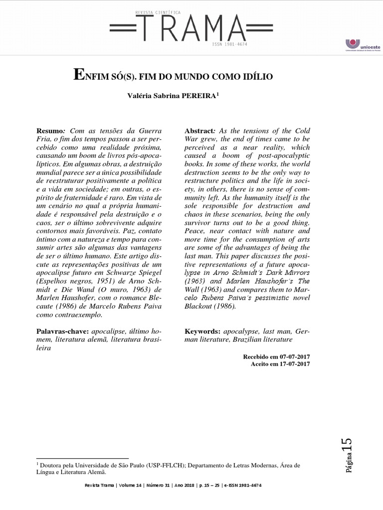 Resumo: Com as tensões da Guerra Fria, o fim dos tempos passou a ser per- cebido como uma realidade próxima, causando um boom de livros pós-apoca- lípticos. Em algumas obras, a destruição mundial parece ser a única possibilidade de reestruturar positivamente a política e a vida em sociedade; em outras, o es- pírito de fraternidade é raro. Em vista de um cenário no qual a própria humani- dade é responsável pela destruição e o caos, ser o último sobrevivente adquire contornos mais favoráveis. Paz, contato íntimo com a natureza e tempo para con- sumir artes são algumas das vantagens de ser o último humano. Este artigo dis- cute as representações positivas de um apocalipse futuro em Schwarze Spiegel (Espelhos negros, 1951) de Arno Sch- midt e Die Wand (O muro, 1963) de Marlen Haushofer, com o romance Ble- caute (1986) de Marcelo Rubens Paiva como contraexemplo.