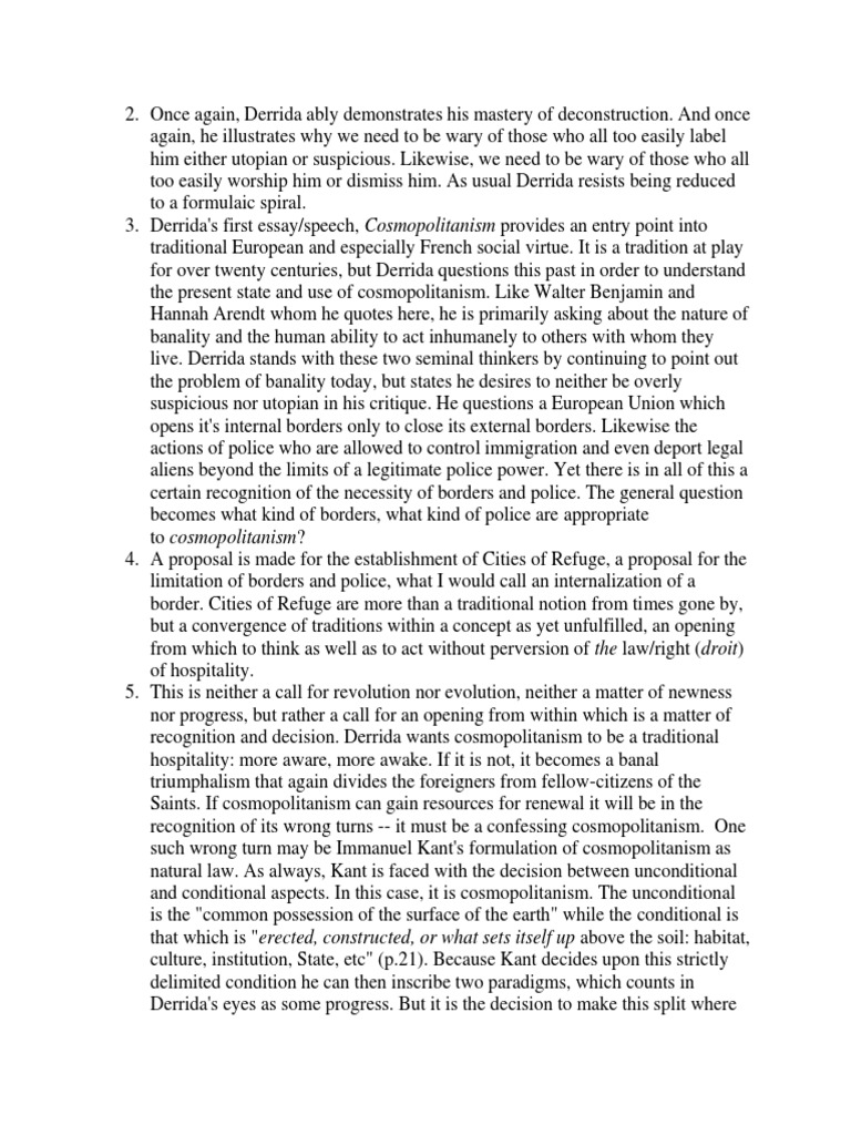 3. Derrida's first essay/speech, Cosmopolitanism provides an entry point into