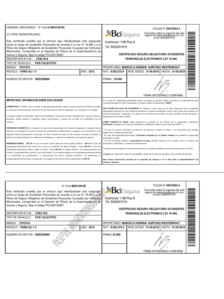 Este certificado acredita que el vehículo aquí individualizado está asegurado seguro en www.bciseguros.cl o en