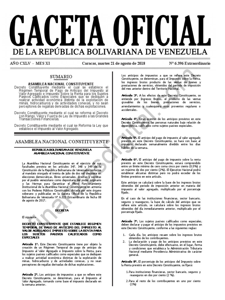 AÑO CXLV - MES XI Caracas, martes 21 de agosto de 2018 N° 6.396 Extraordinario