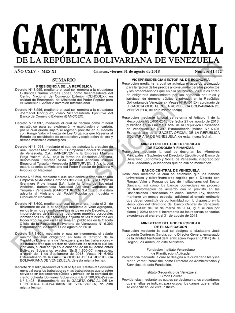 AÑO CXLV - MES XI Caracas, viernes 31 de agosto de 2018 Número 41.472