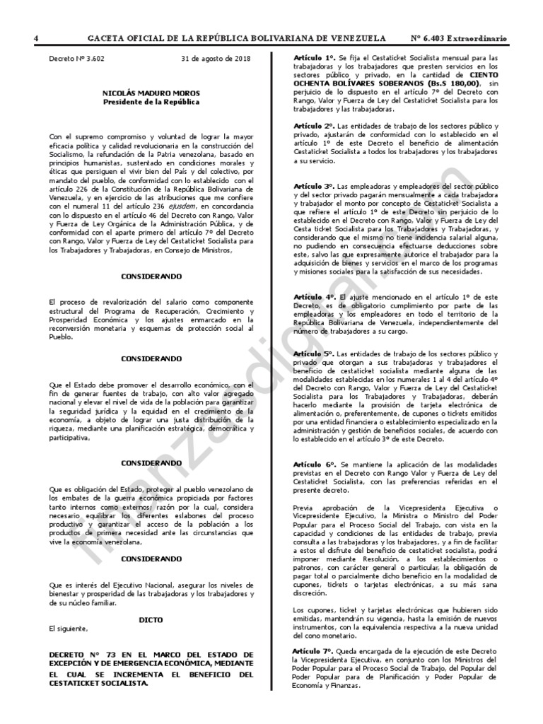 Decreto N° 3.602 31 de agosto de 2018 Artículo 1°. Se fija el Cestaticket Socialista mensual para las