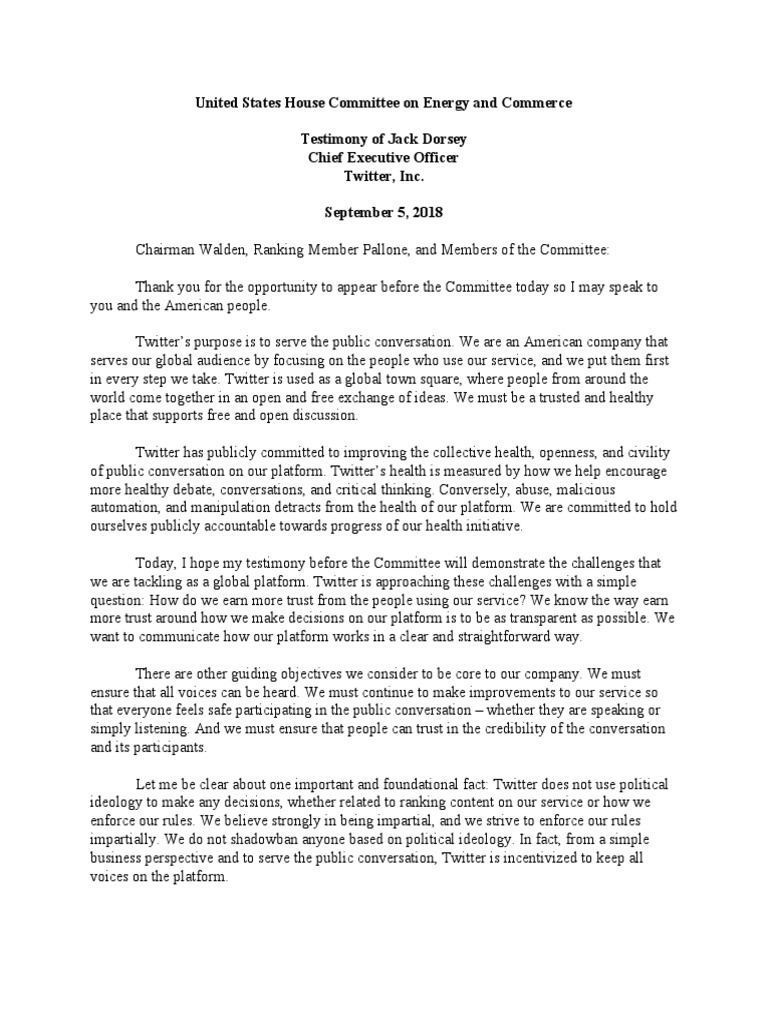 Testimony of Jack Dorsey Chief Executive Officer Twitter, Inc.