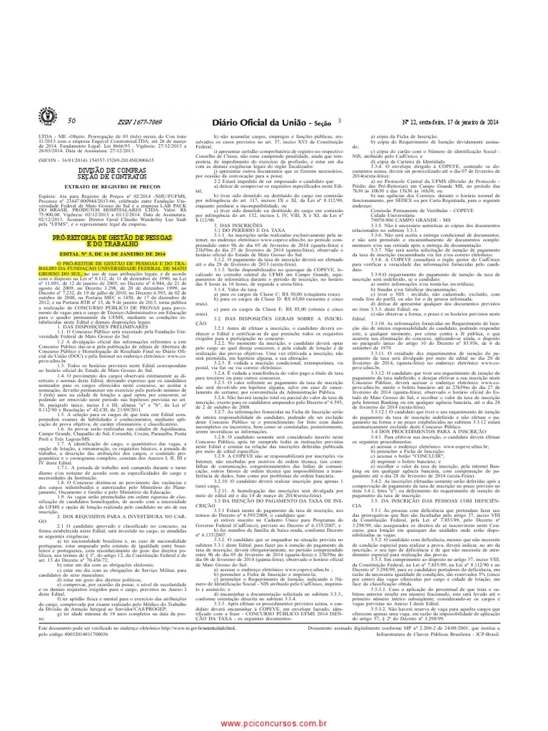 versidade Federal de Mato Grosso do Sul. exigidos para a participação no concurso. acarreta sua eliminação do concurso, aplicando-se ainda, o disposto