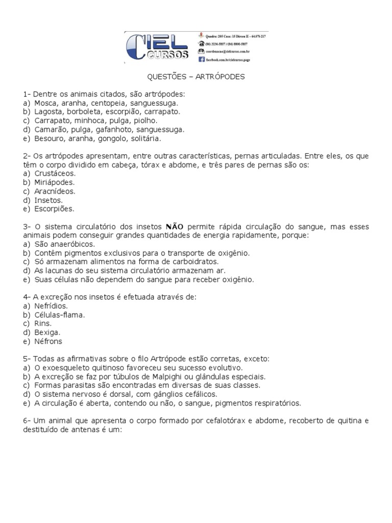 2- Os artrópodes apresentam, entre outras características, pernas articuladas. Entre eles, os que