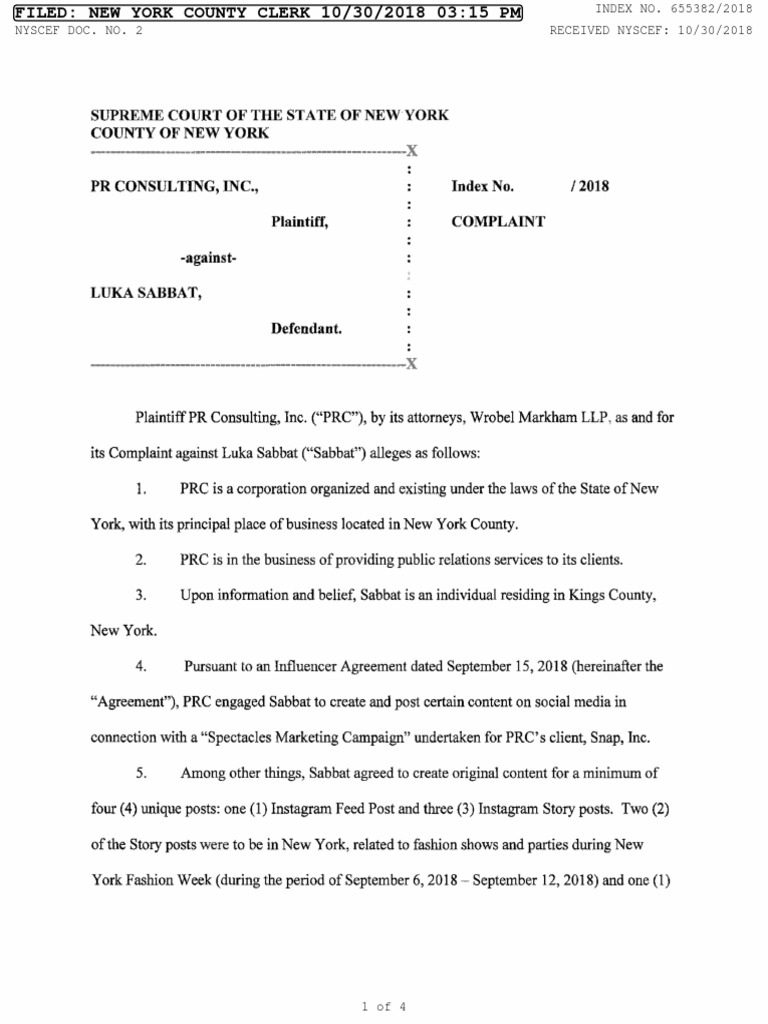 "Agreement"), PRC êñgaged Sabbat to create and post certain content on social media in