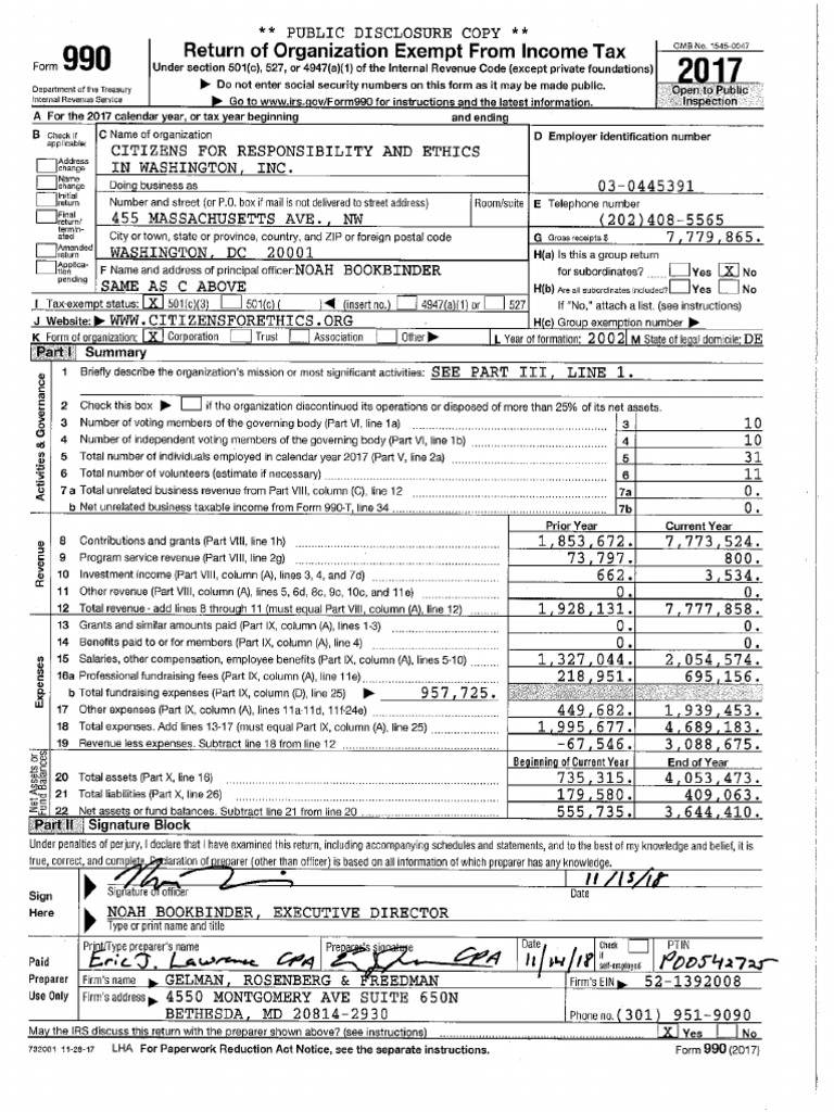 Citizens for Responsibility and Ethics in Washington's (CREW) 2017 tax forms Beschreibung: The 2017 Form 990 (tax forms) for CREW, a liberal "nonpartisan" watchdog organization that regularly files complaints and litigation against Trump, which was provided to the Washington Free Beacon by the organization.