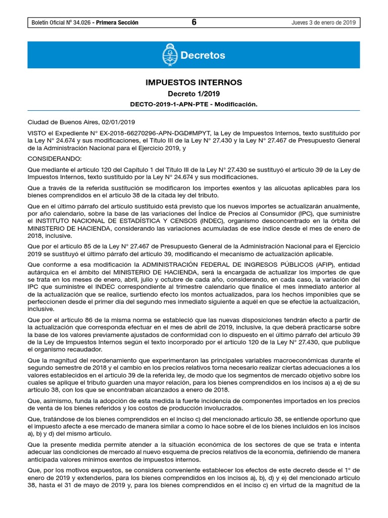 Impuestos Internos, texto sustituido por la Ley N° 24.674 y sus modificaciones, se faculta al PODER EJECUTIVO