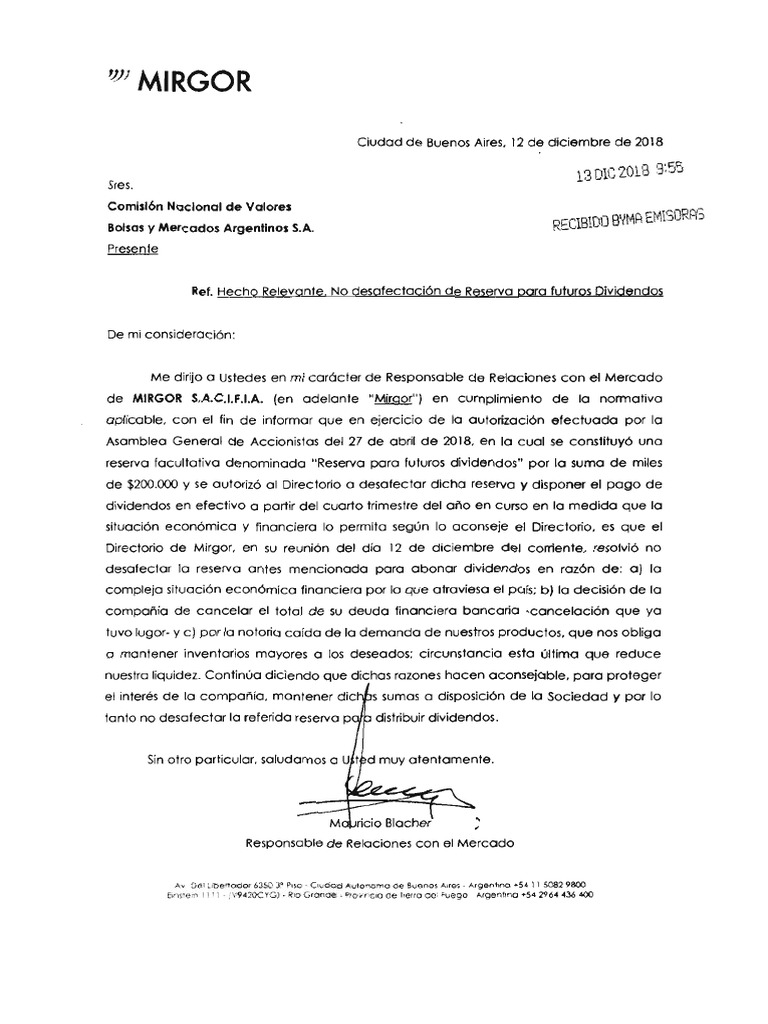 de MIRGOR S.A.C.LFLA. (en adelante "Misgor’) en curnplimiento de la normative