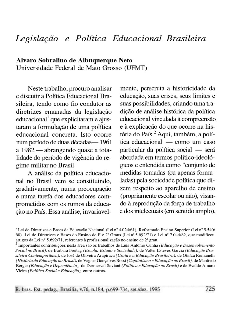 tória do País. 2 Aqui, também, a polí- tica educacional — como um caso particular da política social — será abordada em termos político-ideoló-
