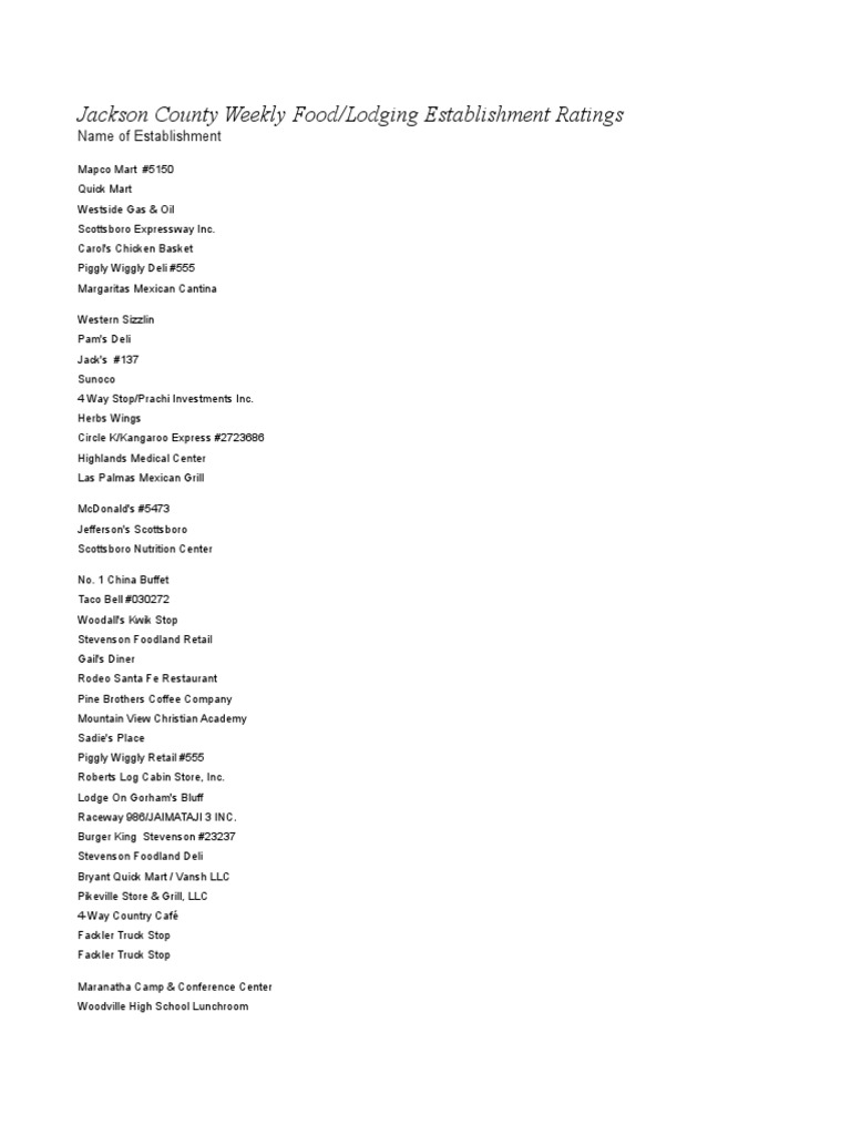Jackson County Weekly Food/Lodging Establishment Ratings