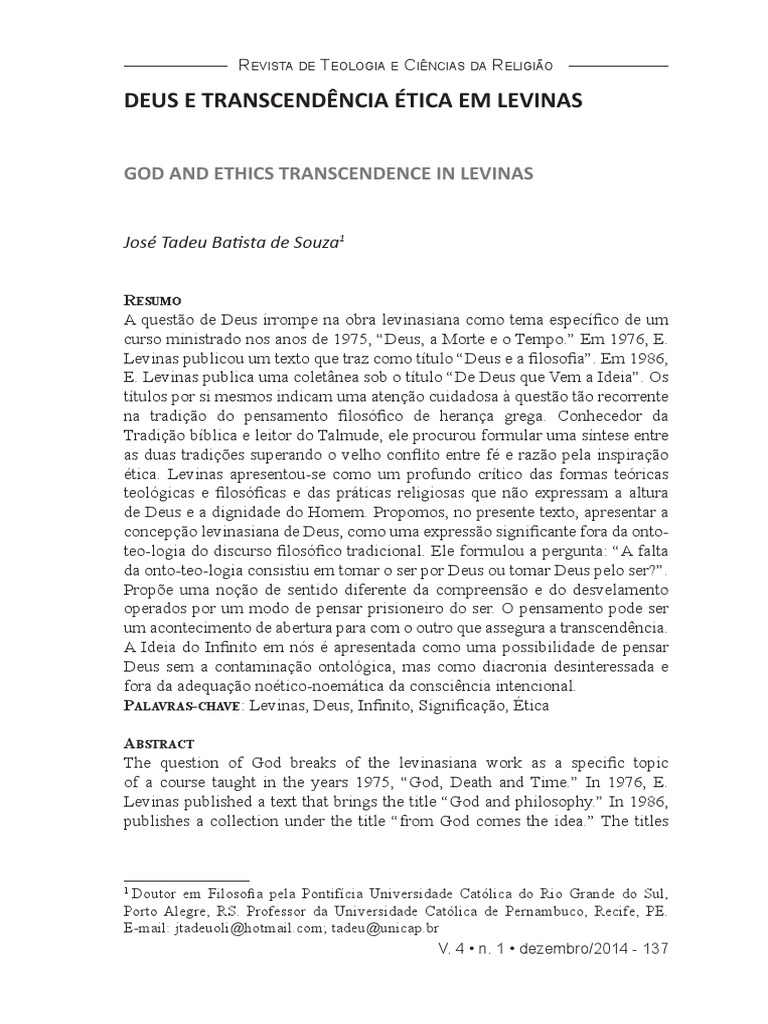 Deus sem a contaminação ontológica, mas como diacronia desinteressada e fora da adequação noético-noemática da consciência intencional. Palav R as - chave : Levinas, Deus, Infinito, Significação, Ética