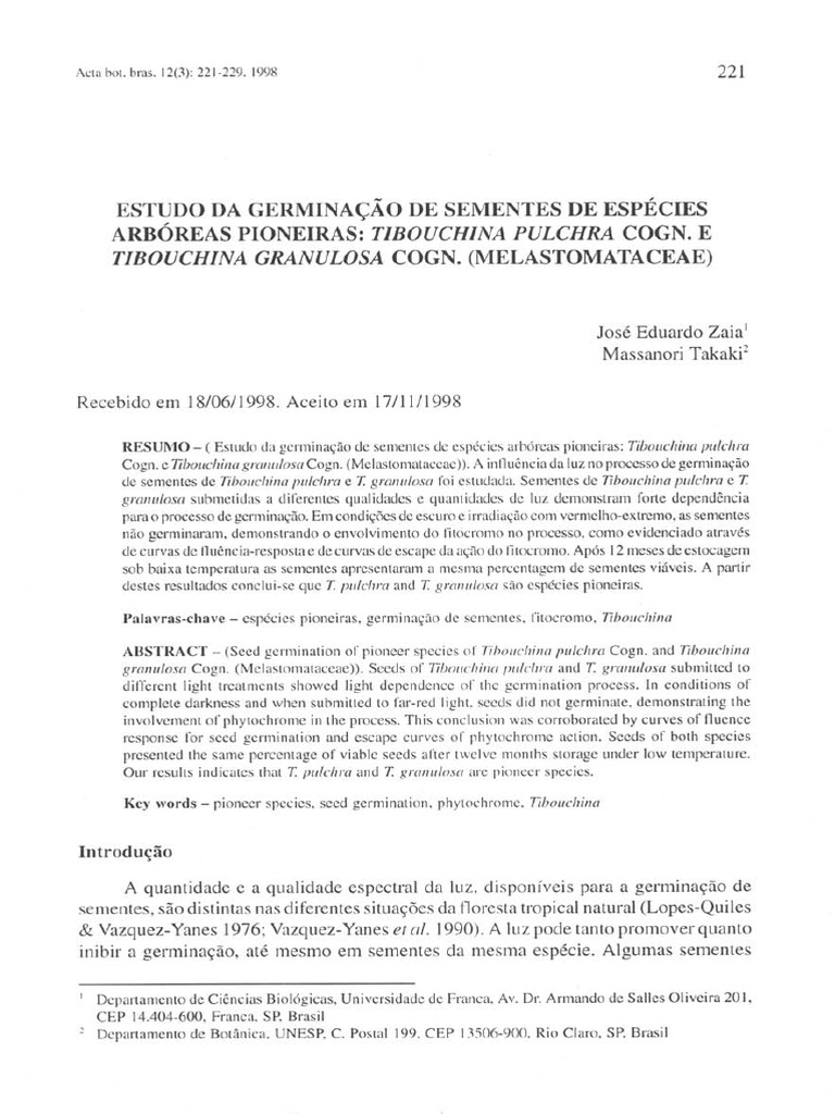 ABSTRACT - (Seed gel'1nination of pioneer spccies 01' Tiboucllina pulell/'{{ Cogn. and Tibouchil1a