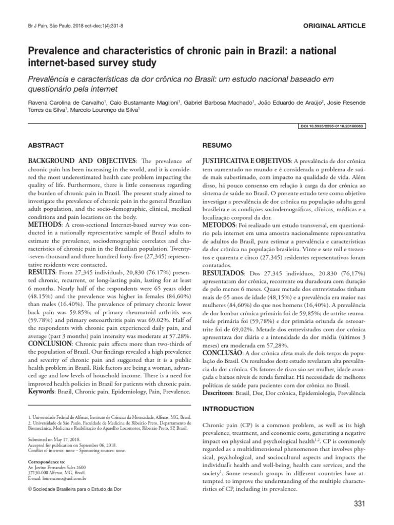 Keywords: Brazil, Chronic pain, Epidemiology, Pain, Prevalence. Descritores: Brasil, Dor, Dor crônica, Epidemiologia, Prevalência