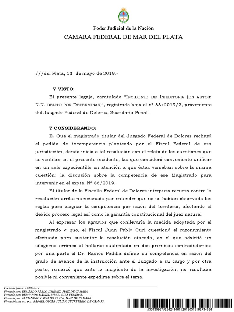 II). Que radicadas las actuaciones en esta Cámara Federal de Mar del