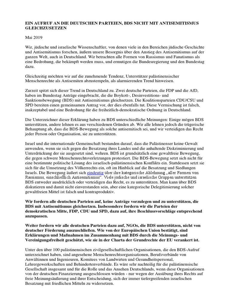 BDS mit Antisemitismus gleichsetzen. Insbesondere fordern wir die Parteien der