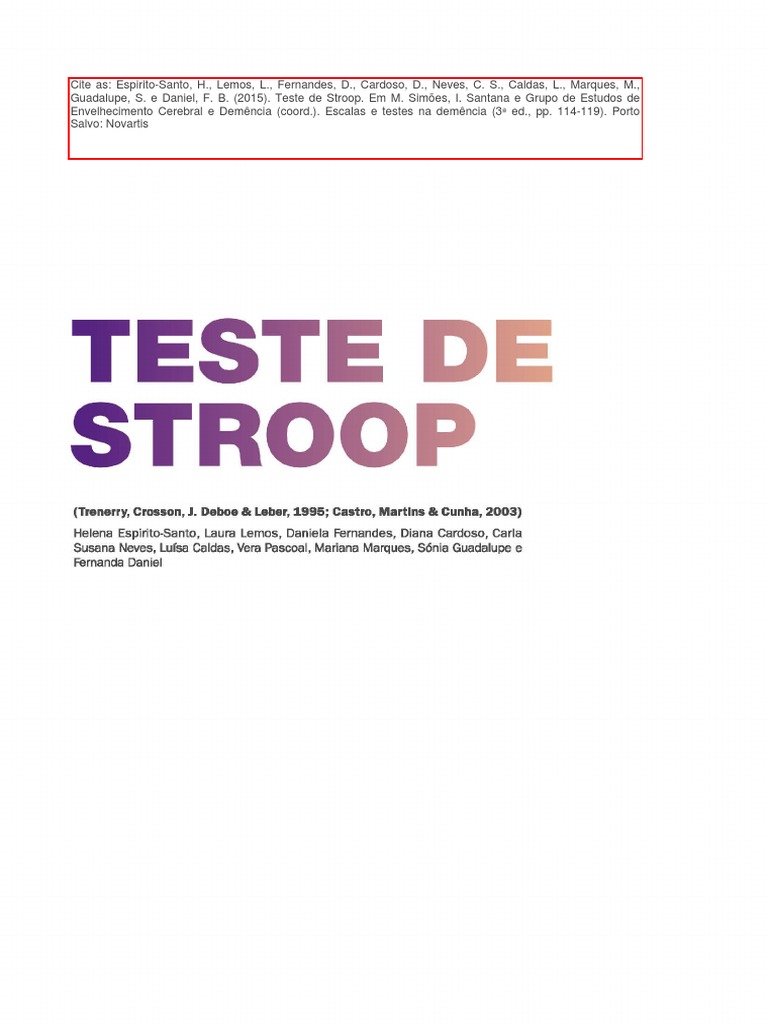 Teste de medida da atenção seletiva de acordo com o paradigma Stroop. Avalia a atenção seletiva (capacidade de inibir informações irrelevantes), inibição (capacidade de suprimir uma tendência de resposta comportamental), flexibilidade cognitiva, velocidade de processamento, inte- ligência fluida e sistema semântico (lezak, Howieson, & Loring, 2004; Strauss, Sherman, & Spreen, 2006). Há mais de 70 anos que o teste Stroop constitui uma referência na avaliação da atenção seletiva (Macleod, 1992). Neste teste nomeia-se a cor de palavras impres- sas em cores incongruentes, tendo de se selecionar o es- tfmulo relevante (a cor) e ignorar os estfmulos distratares (as palavras) que podem induzir erros e aumentar o tempo de resposta. A alteração na velocidade de nomeação de palavras coloridas (NP) e de nomeação de cores de pala-