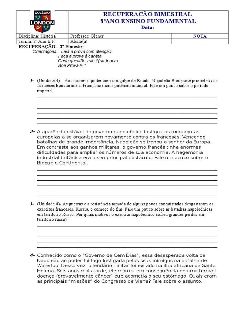 1- (Unidade 4) – Ao assumir o poder com um golpe de Estado, Napoleão Bonaparte prometeu aos