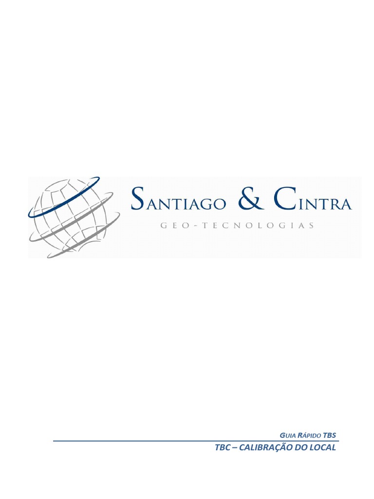 Este guia tem como objetivo orientar o usuário do software Trimble Business Center (TBC) a realizar uma calibração do local a partir de um levantamento GNSS de maneira rápida e objetiva, sem qualquer menção a metodologia de trabalho adotada por cada profissional. Para instruções ou procedimentos das demais funções do software, consulte o manual de instruções e/ou tutoriais específicos. Entre em contato com o setor de suporte técnico da Santiago & Cintra para mais informações. Dúvidas, sugestões ou correções podem ser enviadas para suporte_gps@santiagoecintra.com.br +55 16 3965-8220