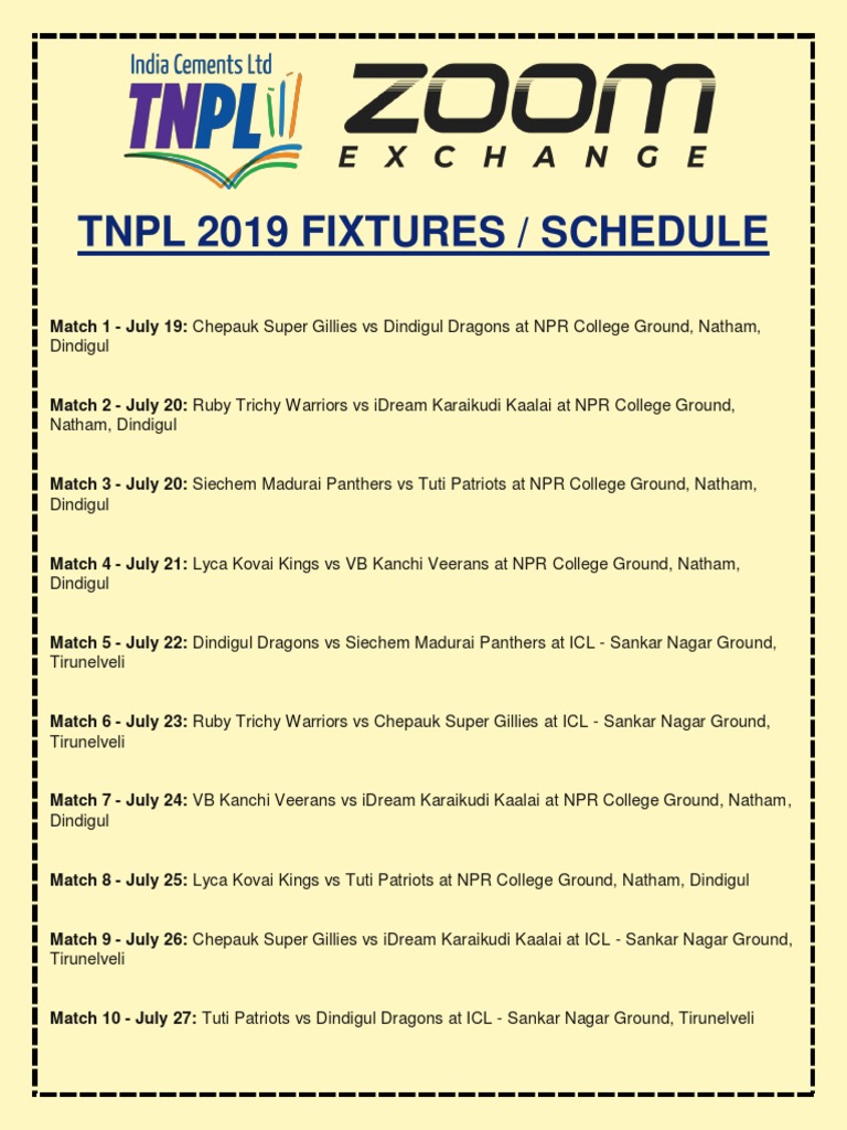 Match 1 - July 19: Chepauk Super Gillies vs Dindigul Dragons at NPR College Ground, Natham,