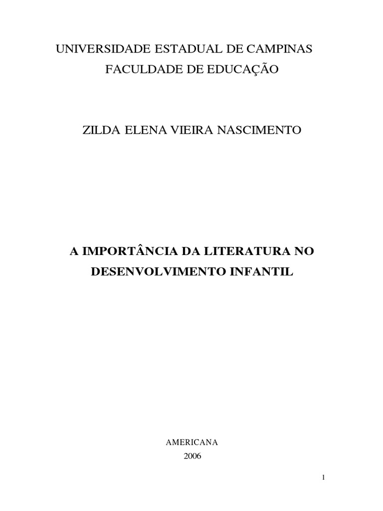 as histórias se incorporaram definitivamente à nossa cultura. Ganharam as nossas casas através da doce voz materna, das velhas babás, dos livros coloridos, para encantamento da criançada. E os pedagogos, sempre à procura de técnicas e processos adequados à educação das crianças, descobriram esta ‘mina de ouro’ – as histórias. Os psicólogos aprovaram. Surgiu a Literatura Infantil. No terceiro capítulo, falo da importância da literatura infantil no desenvolvimento da criança e de como insiro esta modalidade de atividade na minha prática diária com as crianças da Educação Infantil. No quarto e último capítulo, falo especificamente da literatura infantil na faixa etária de 1 a 6 anos e de como as crianças se comportam em relação às histórias durante esse período do desenvolvimento. Enfim, este memorial pretende resgatar um pouco da minha prática como educadora e a importância do trabalho com Literatura Infantil que sempre procurei desenvolver com meus alunos de forma significativa e enriquecedora.