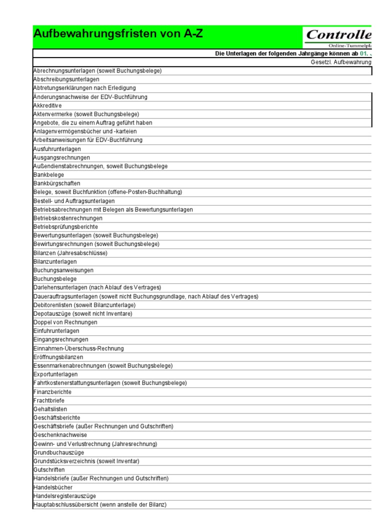 Aufbewahrungsfristen von A-Z