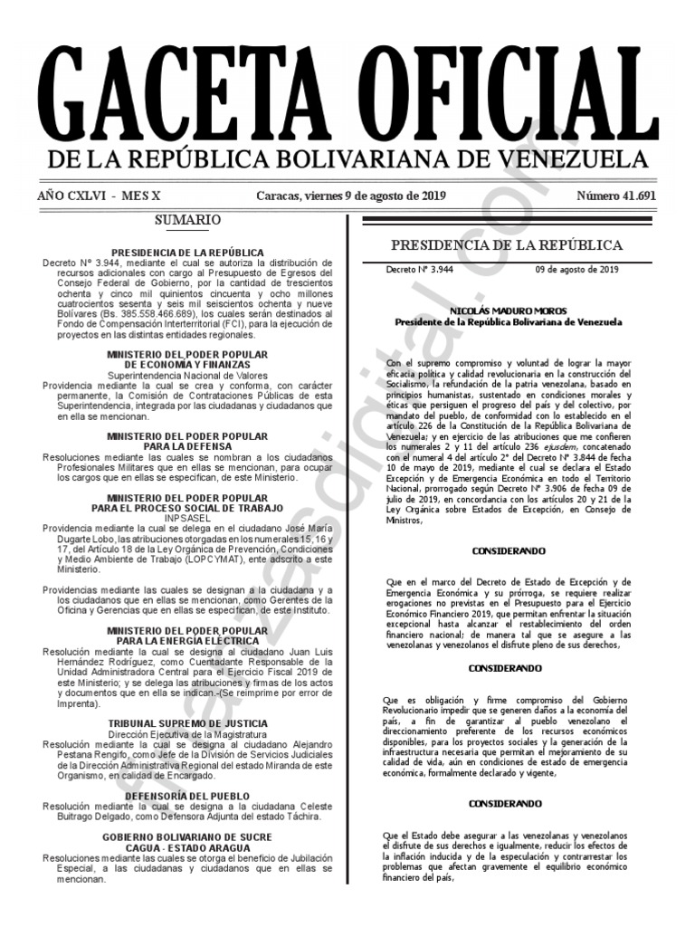 recursos adicionales con cargo al Presupuesto de Egresos del Decreto N° 3.944 09 de agosto de 2019