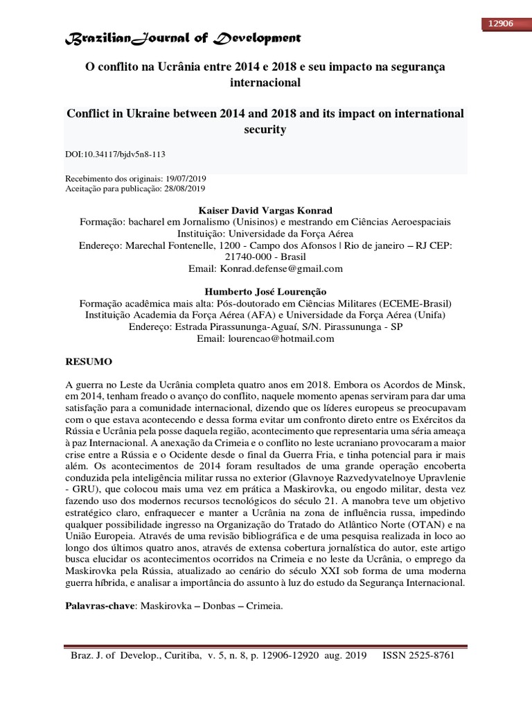 PRAZERES. J.P. O conflito na Ucrânia sob o ponto de vista da segurança e defesa. Jornal de