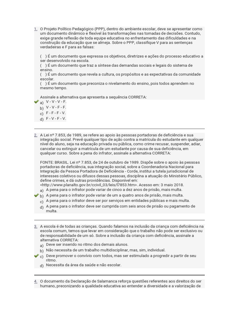 10. Para valorizar a diversidade, no que diz respeito à inclusão, é necessário atender a todas as especificidades, sejam elas físicas ou intelectuais. Dessa forma, o sujeito tem acesso a seus direitos e a oportunidade de se desenvolver como cidadão com os mesmos direitos dos demais. Sobre a perspectiva da inclusão, classifique V para as sentenças verdadeiras e