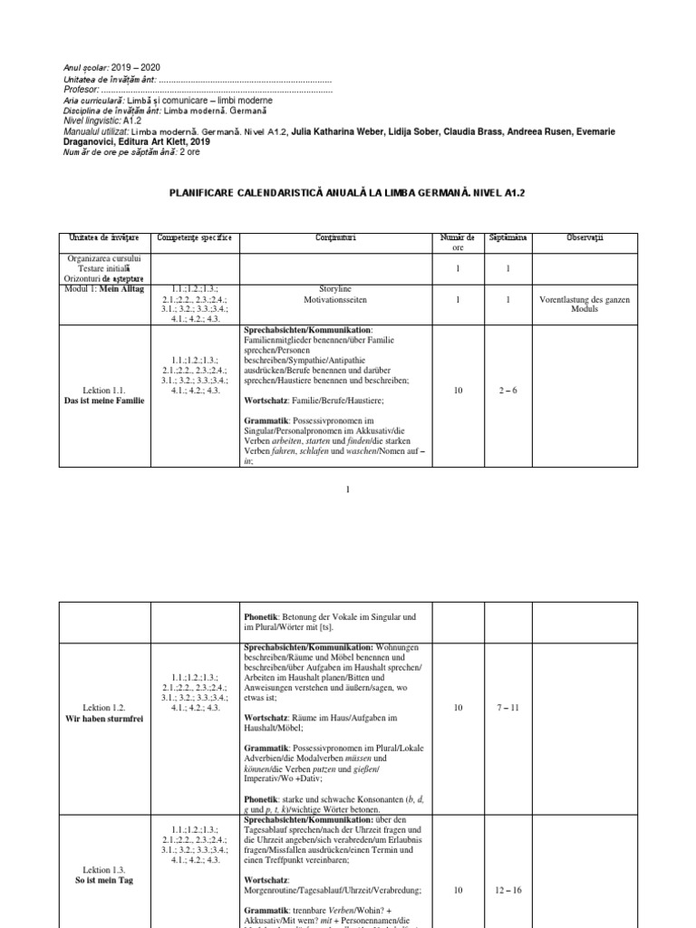 PLANIFICARE CALENDARISTICĂ ANUALĂ LA LIMBA GERMANĂ. NIVEL A1.2