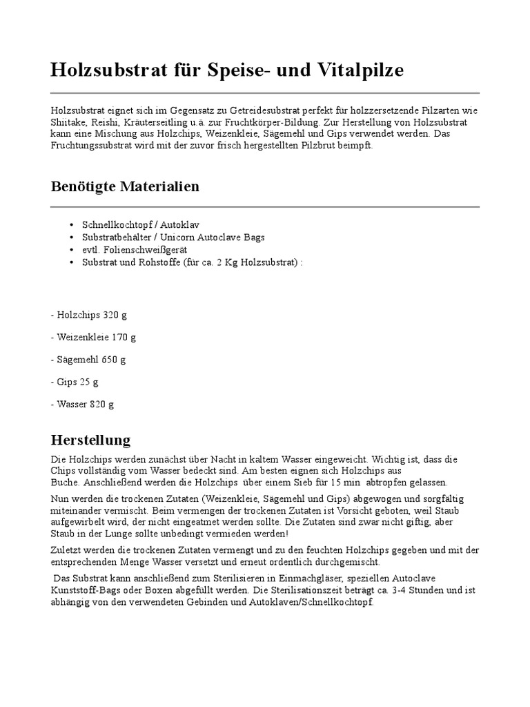 • Substrat und Rohstoffe (für ca. 2 Kg Holzsubstrat) :