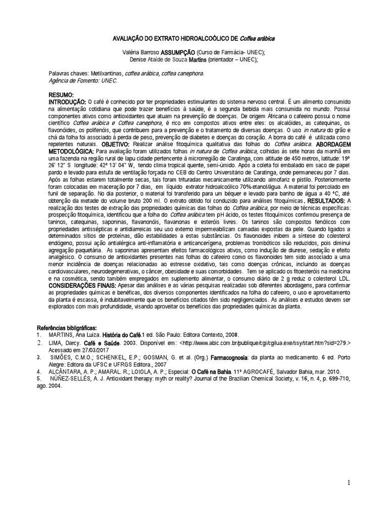 METODOLÓGICA: Para avaliação foram utilizados folhas in natura de Coffea arábica, colhidas às sete horas da manhã em