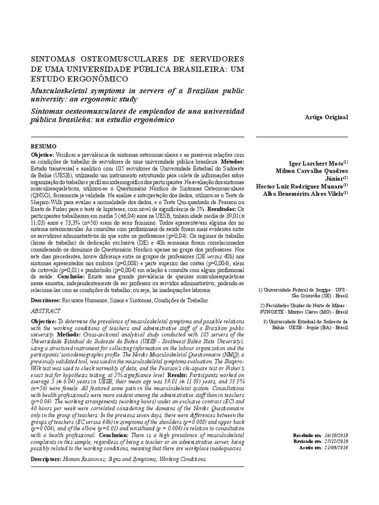 Objective: To determine the prevalence of musculoskeletal symptoms and possible relations 3) Universidade Estadual do Sudoeste da