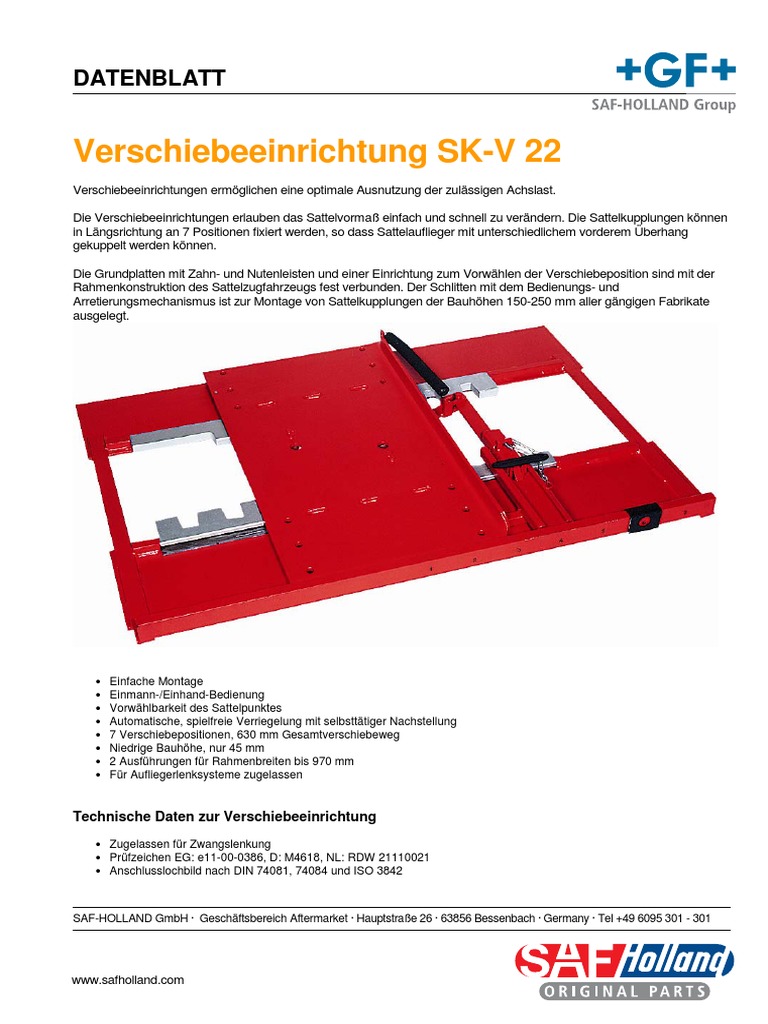 GF Verschiebeeinrichtungen von SAF-HOLLAND sind gemäß 94/20/EG bauartgenehmigt. Veränderungen an der